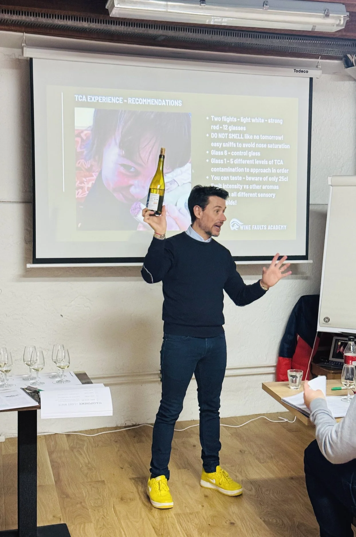 We use "intentionally contaminated" glasses that are spiked and always provided with a control sample to taste against. This allows professionals to build a clear tasting reference between a fault and a wine that maintains the integrity of its organoleptic characteristics.